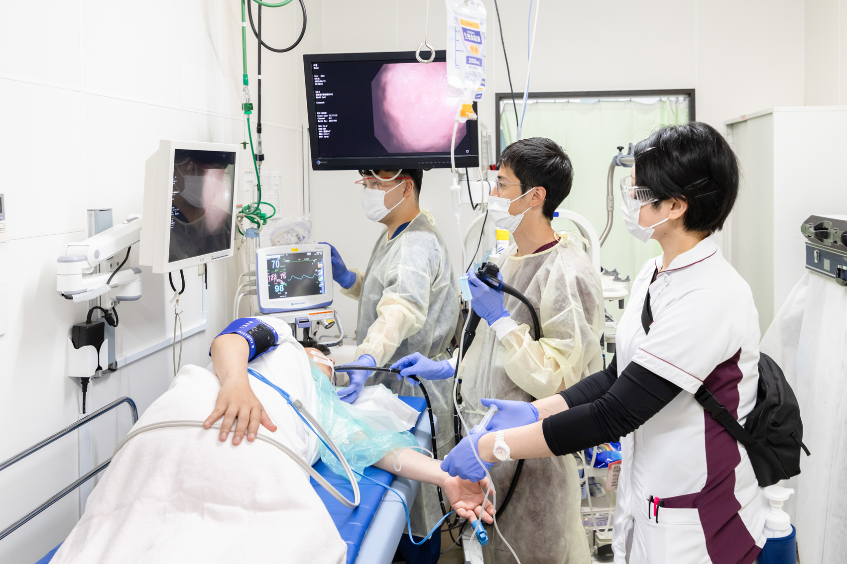 診療補助業務、処置室での採血や注射、点滴挿入、救急車対応、内視鏡検査の介助など多岐にわたります。限られた時間の中で、コミュニケーションをとりながら処置や看護に携わっています。